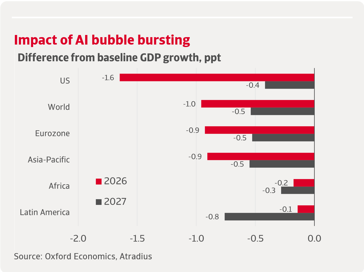- Risks remain high: a sharp drop in AI confidence could trigger a global downturn, with the US and Asia-Pacific the most exposed